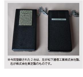 ポケットベルB型RC11は、1968年にポケットベル(無線呼出サービス)がスタートしたときに使われた最初の端末です。"携帯電話登場以前の個人の通信ツールとして、その後のポケットベルの爆発的普及の礎となった存在として重要である"とのことから、未来技術遺産に登録されました。