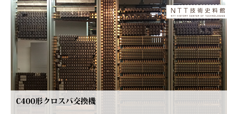 ![]() C400形クロスバ交換機![]() C400形クロスバ交換機 積滞解消を実現した高機能クロスバ交換機1950年代、日本電信電話公社(電電公社、現NTT)が検討・開発を開始したクロスバ交換機は、縦横の格子状(クロス)に金属の棒(バー)を配したクロスバスイッチを用いる交換機で、日本においては海外の交換機を参考にしながらも独自の技術開発を重ねました。その集大成ともいえる「C400形クロスバ交換機」は、回線収容数も格段に多く、動作も速い高機能でありながら、長寿命で経済的にも優れた交換機として、1967年に導入が開始されました。 当時、電話の需要に設置が追い付かない「積滞」状態が大きな課題となり、その解消が強く求められていましたが、この交換機の普及により、申し込んだら“すぐつく電話”(=積滞解消)、かけたら“すぐつながる電話(=全国自動即時化)”が1970年代後半に実現し、電話サービスが格段に向上しました。 また、「C400形クロスバ交換機」は当時、世界で最も優れた性能と経済性を持つ交換機として日本の重要な輸出品にもなり、通信機器産業の基盤強化に大きく貢献しました。 その後の自動交換機は、さらなるサービス向上に向けて、電子交換機、ディジタル交換機へと発展していきます。 C400形クロスバ交換機開発の背景1890年に東京・横浜で手動交換機を用いて始まった電話交換業務は、自動交換機であるステップ・バイ・ステップ交換機を1926年に導入し、自動交換の歴史が始まりました。その後、戦後復興から高度成長へと向かい日本経済が成長していく過程で、電話需要が急速に増大し、加入申し込みは増加する一方、電話の架設が追いつかない状況(積滞)が深刻化していました。 また、市内通話はステップ・バイ・ステップ交換機で自動化されていたものの、市外通話については交換手による手動交換が行われており、さらなる利便性が求められていました。 電電公社発足後の二大目標としての積滞解消と全国自動即時化に対応するため、海外で開発され始めたクロスバ交換機を参考にしながら、日本に適した方式のクロスバ交換機の研究開発が進められました。 ![]() クロスバスイッチ C400形クロスバ交換機の特長クロスバ交換機とは、格子状に配された金属の棒の交叉点に配置されたクロスポイント接点からなる通話路スイッチを電磁石の力で動かし通話路を形成する交換機で、ステップ・バイ・ステップ交換機よりも耐久性に優れ、雑音も少ないことから世界で注目されていました。 当初、海外のクロスバ交換機が先行していましたが、日本にクロスバ交換機を導入するにあたっては、日本独自の方式で実現することをめざしました。日本の交換網改善に適した将来方式を実現すべきという気運や、既存設備との整合性や将来に向けた融通性などを考慮して選定された方式でした。部品については、実績のあるウエスタン形クロスバスイッチ、ワイヤスプリングリレー(*1)など信頼性の高い部品を採用しました。 初期にはC4・5、C8、C6などの機種が開発され、その後さらなる改良、さまざまな方式検討・研究開発の積み重ねにより、「C400形クロスバ交換機」として集大成されました。 「C400形クロスバ交換機」は、全共通制御方式(*2)を実現し、回線収容数61,440端子、トラヒック容量2,880アーラン(*3)という当時最も大規模な交換能力を持っていました。C400形と同じ構成の小規模交換機C460形も開発され、全国をきめ細かくカバーすることができました。世界でも、最も経済的かつ省スペースの交換機として評価されました。 また、市内接続機能のほかに市外発着信機能を付加することにより、市内および市外交換機として適用領域を広くすることが可能になりました。 C400形クロスバ交換機がもたらした効果国内へ「C400形クロスバ交換機」が広く普及することにより、1978年には加入電話の積滞解消により“すぐつく電話”、1979年には全国自動即時化により“すぐつながる電話”が実現されました。また、プッシュホンの実用化と組み合わせ、短縮ダイヤル・転送などの新サービスも提供可能となり、国民生活の利便性を飛躍的に向上させるとともに、経済発展にも大きく貢献しました。 また、「C400形クロスバ交換機」は、優れた性能と経済性で世界市場へ輸出され、外貨獲得にも貢献しました。