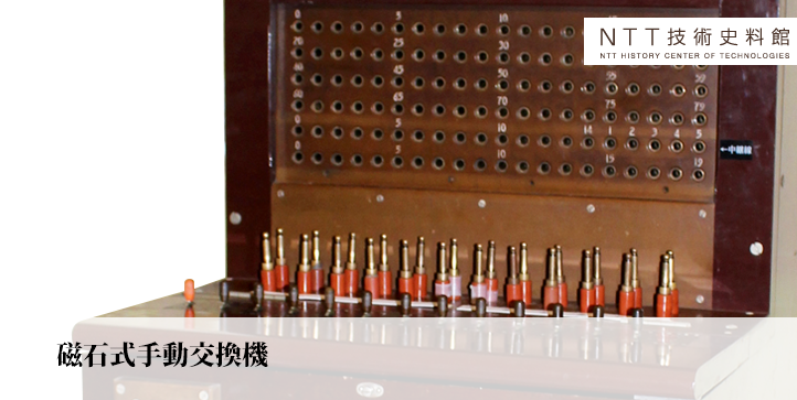 ![]() 磁石式手動交換機磁石式手動交換機導入とその後の展開1854年、ペリー来航とともに日本に電信技術がもたらされてから、1870年には国内で電報の取り扱いが始まりました。また、1876年にアレキサンダー・グラハム・ベルにより電話機が発明されたのち、電話機および交換機の技術が日本にも伝わり、工部省・逓信省での導入検討・商用試験などを経て、1890年には東京・横浜で手動交換機を用いた電話交換業務が開始されました。 そして、磁石式手動交換機は自動交換機が普及した後も小規模な交換局で長く利用され、電話の全国完全自動化に至る1979年まで、農村や離島などの通信を長く支えました。 ![]() 磁石式手動交換機 磁石式手動交換機のしくみ手動交換機とは、電話をかける人(発呼者)が電話機から交換機へ発呼を知らせ、交換手が発呼者と電話を受ける人(被呼者)の電話機を交換機の接続紐を操作することにより交換接続するというしくみの交換機を指します。また、発呼者が磁石式電話機のハンドルを回すことにより発電し、交換機へ発呼を知らせるしくみを持つものが「磁石式手動交換機」と呼ばれています。 日本での電話創業時には「磁石式手動交換機」が用いられていました。 磁石式自動交換機の保存と動態展示NTT技術史料館では、交換手の動作・頭の働きを実体験できる動態展示を作るという目的のもと、OB運営サポーターが中心となり、実際に使用されていた交換機を整備して通話体験・交換手体験が可能な状態に復元しました。また、電話機には磁石式手動交換機と同時期に使われていた「デルビル磁石式電話機」が使用できるため、電話をかける・交換手として電話をつなぐ・電話を受けるという一連の動作が体験できます。 磁石式手動交換機の復元についての詳細は、下記リンク先をご覧ください。 用語解説
