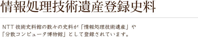 「情報処理技術遺産」や「分散コンピュータ博物館」とは、 一般社団法人情報処理学会の "日本の歴史的コンピュータとその開発に携わった人々に関する史料を集めたバーチャル博物館「コンピュータ博物館」" における認定制度によるものです。