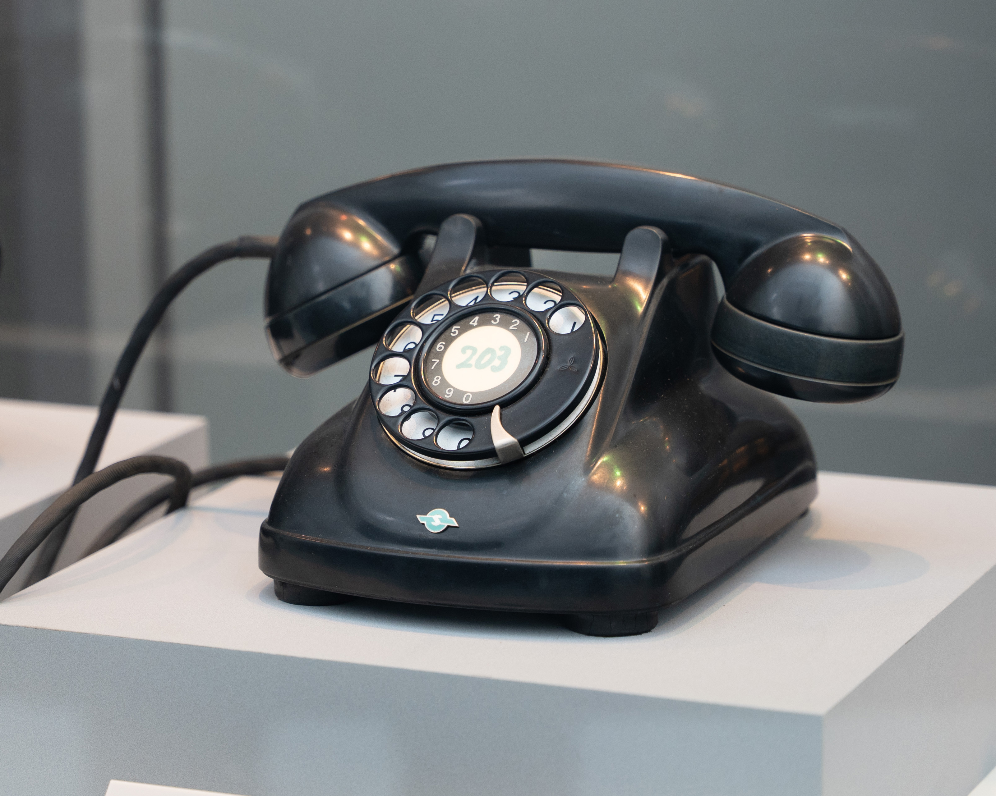 戦後復興期の社会活動を支えた電話機で、日本独自の技術開発により1950年に誕生しました。これまで粗悪であった音響部分を徹底的に研究し音響測定手法の確立や、物理特性と人の心理特性との定量的な把握などの科学的基礎検討、抜本的に改良することで、当時の最先端と言える優秀な通話品質を実現しました。流線形のデザインも特徴の一つで、高い通話品質に加えデザインも改良されました。音質性能の高さは「ハイ・ファイ(*1)電話機」と呼ばれるほどでした。